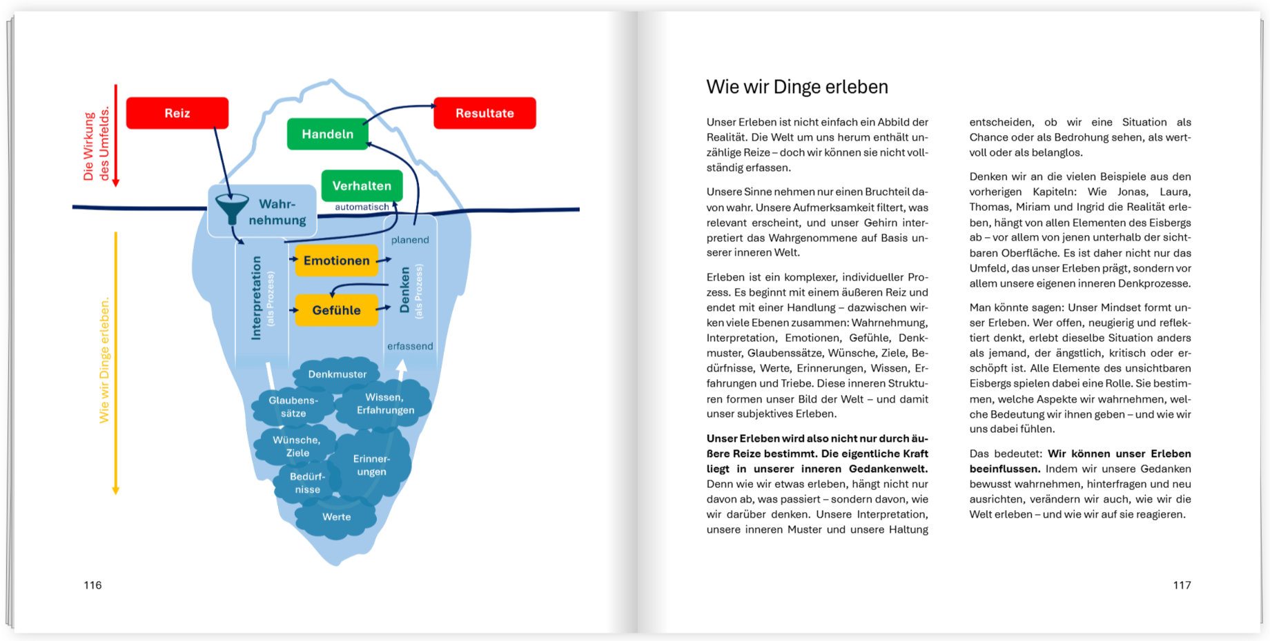 Im Zentrum steht ein visuelles Modell, das Denkprozesse sichtbar macht und dabei tief unter die Oberfläche blickt – wie bei einem Eisberg. Es zeigt, wie Wahrnehmung, Interpretation, Emotionen, Denkmuster, Bedürfnisse und Werte unser Denken und Handeln beeinflussen. Jedes Themenfeld lädt mit gezielten Fragen zur Vertiefung und Selbstreflexion ein.